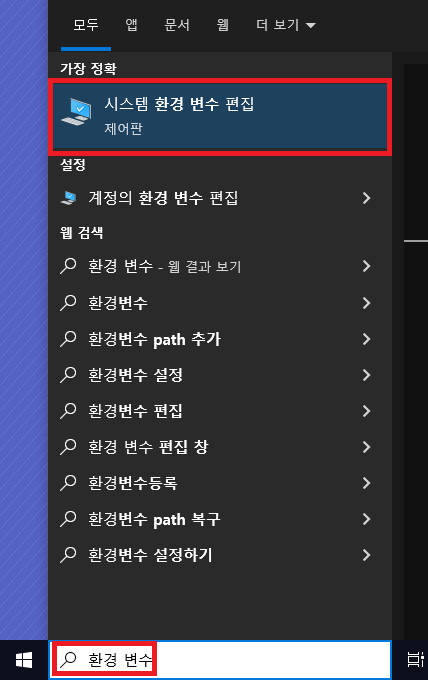 - 1. 먼저 윈도우 검색창에 환경 변수를 입력해서 시스템 환경 변수 편집으로 들어간다
