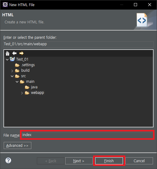 - 4. 파일 명을 입력하고 Finish를 눌러 파일 생성