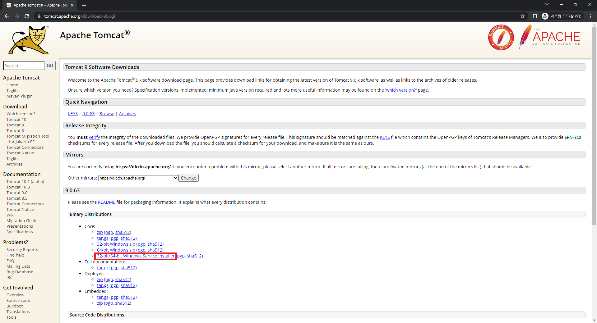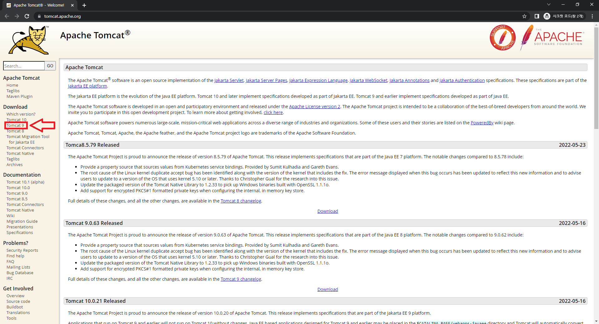 - 1. 왼쪽에 Download 카테고리의 Tomcat9를 클릭한다