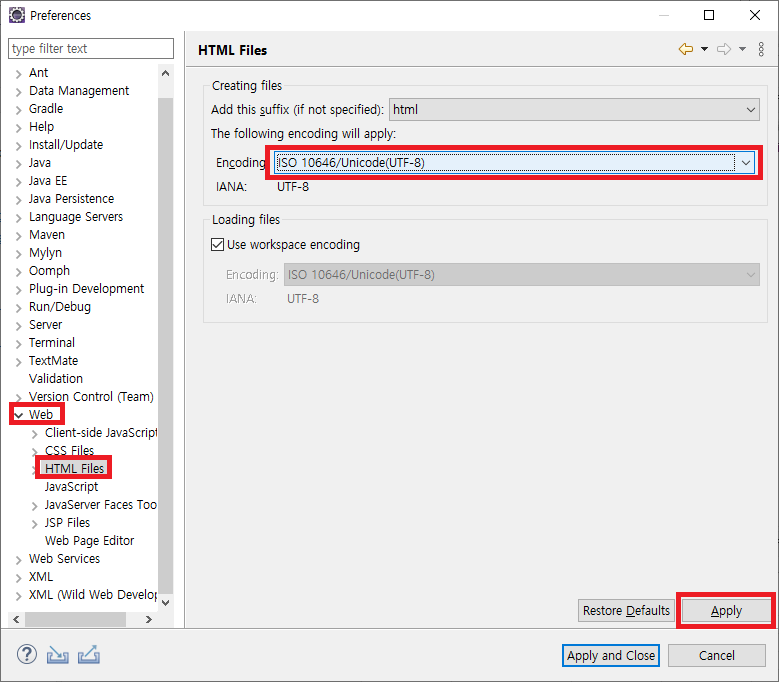 - 4. General - Workspace의 Textfile encoding을 UTF-8로 바꿈