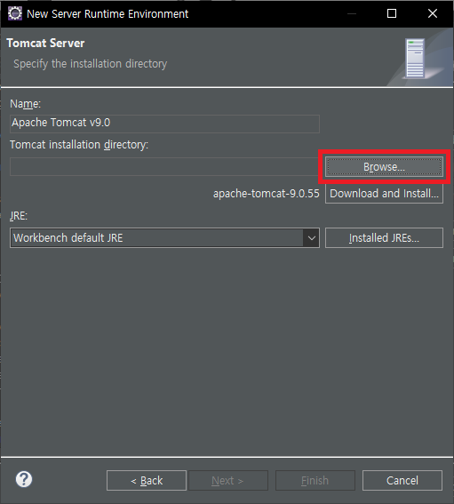 - 3. Tomcat이 위치한 폴더를 지정하기 위해 Browse...을 클릭