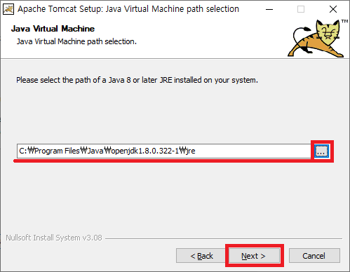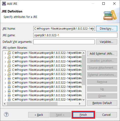 - 4. 설치된 JRE 폴더 선택 (경로 : C:\Program Files\Java\openjdk1.8.0.322-1\jre)