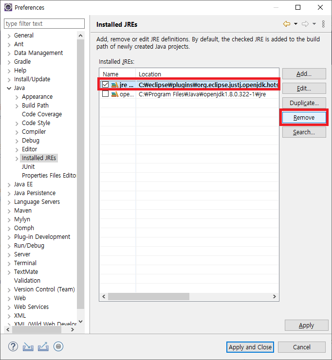 - 3. Java - Installed JREs에 JRE의 버전 및 폴더위치가 Add되어 있는지 확인