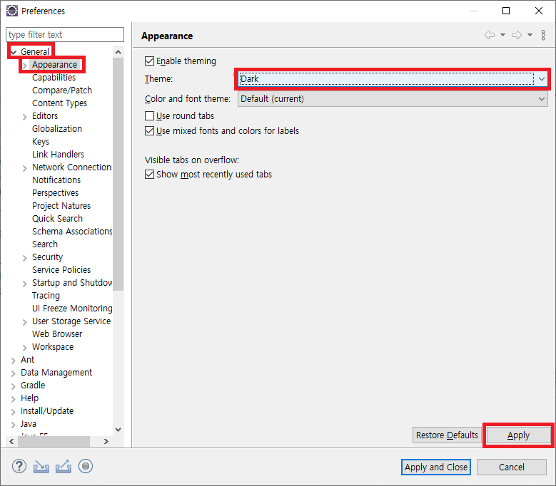 - 8. General - Appearance에서 Theme를 자신의 마음에 드는 테마로 바꿈