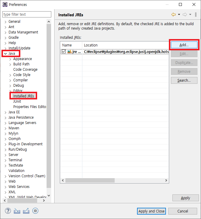 - 1. 기본으로 잡혀있는 JRE가 있지만 일단 무시하고 Add를 클릭