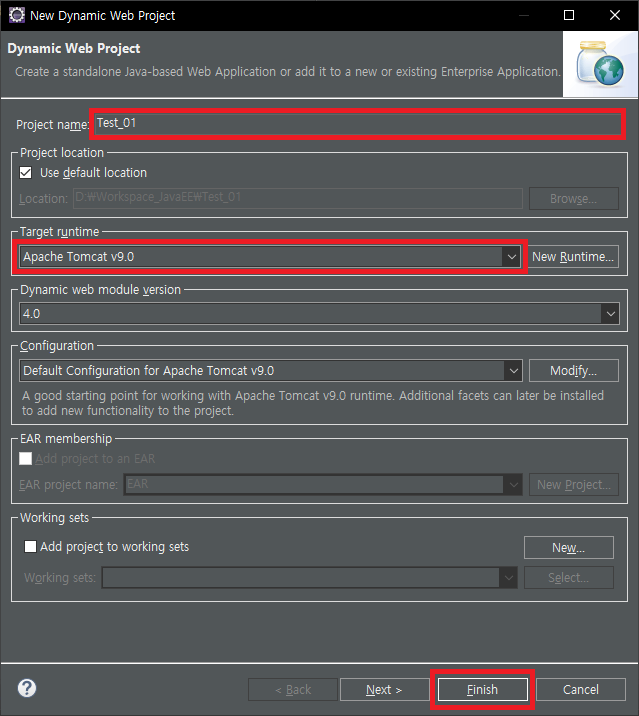 - 2. 프로젝트 명을 입력하고 Target Runtime이 설정한 값으로 되어 있는지 확인