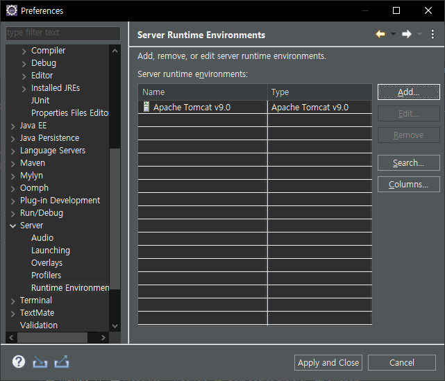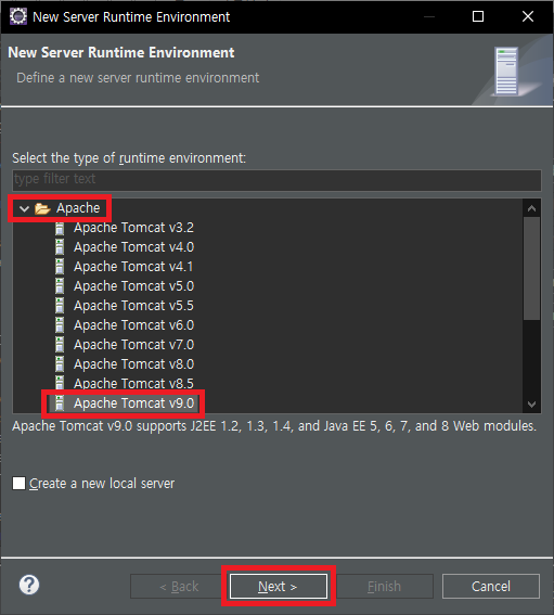 - 2. Apache의 Tomcat을 자신이 설치한 버전(여기서는 v9.0)을 선택 후 Next