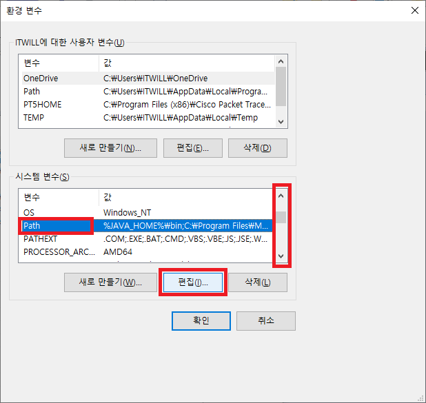 - 5. 스크롤을 조금 내려서 변수 이름이 "Path"인 항목을 클릭후 편집을 클릭한다