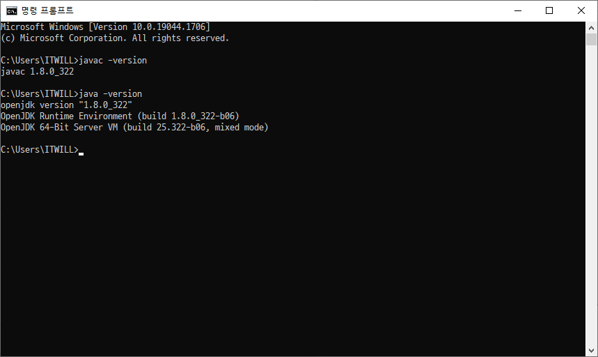 - 이제 "javac -version"이나 "java -version"명령어를 입력하면 설치된 JDK의 버전을 확인할 수 있게 된다