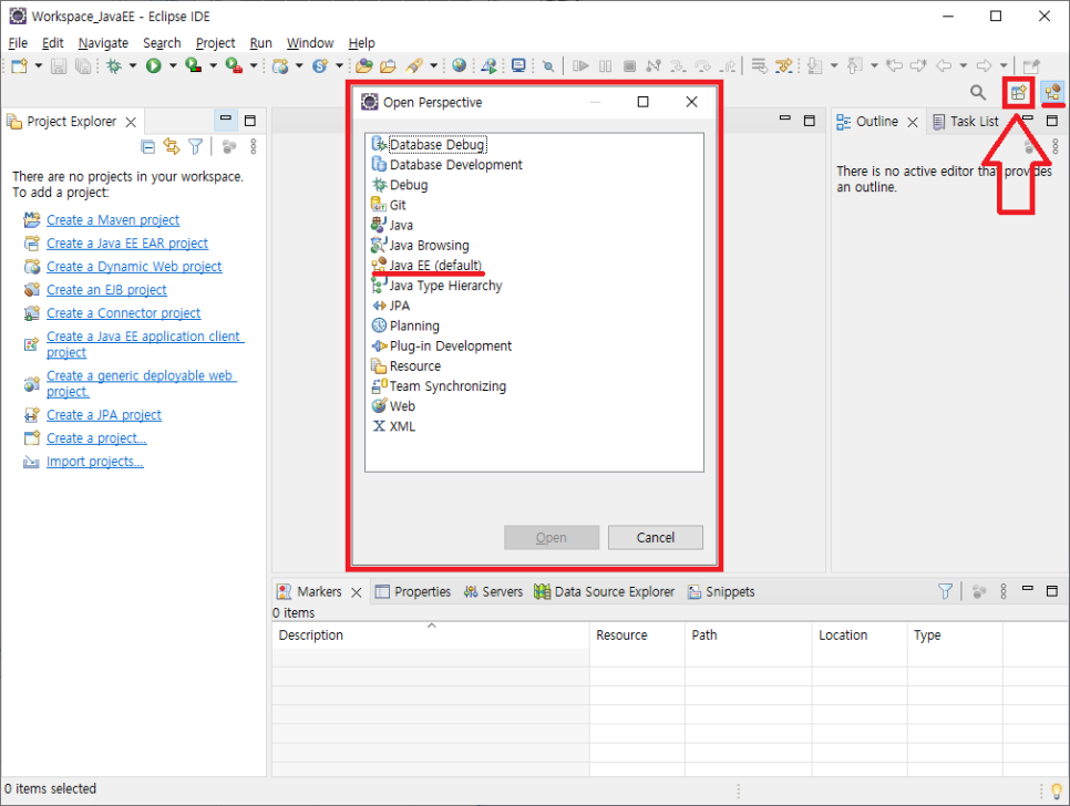 - 오른쪽 상단의 아이콘을 클릭해서 커피 콩모양(Java EE)이 되어 있는지 확인