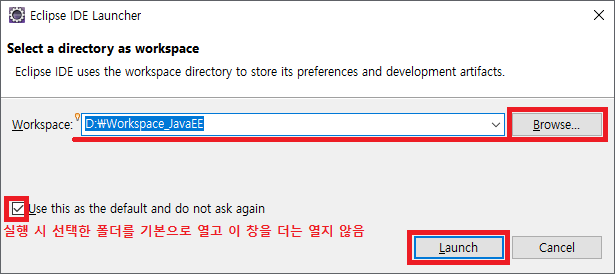 - 6. 첫 시작시 어떤 폴더로 Eclipse를 실행 할 지 모르기 때문에 이제부터 실행될 JavaEE IDE폴더를 만듬